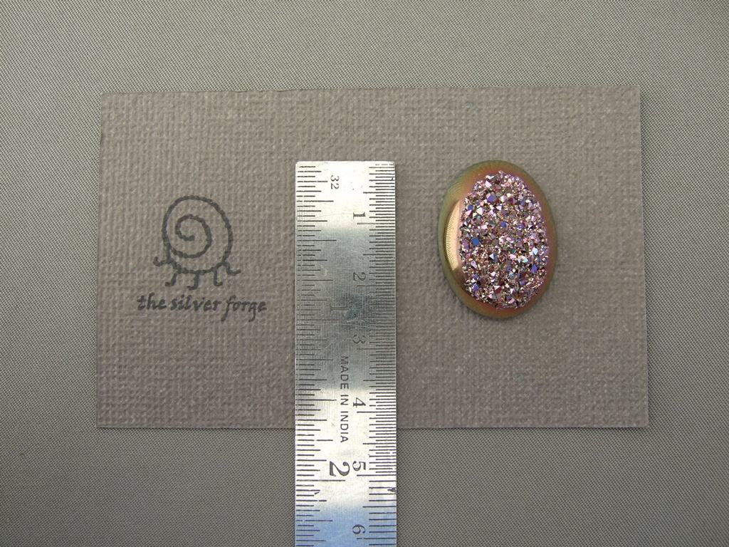 The sweet pink titanium coated drusy agate gemstone cabochon shown here is 26mm long. You can read more about what drusy agate is here.