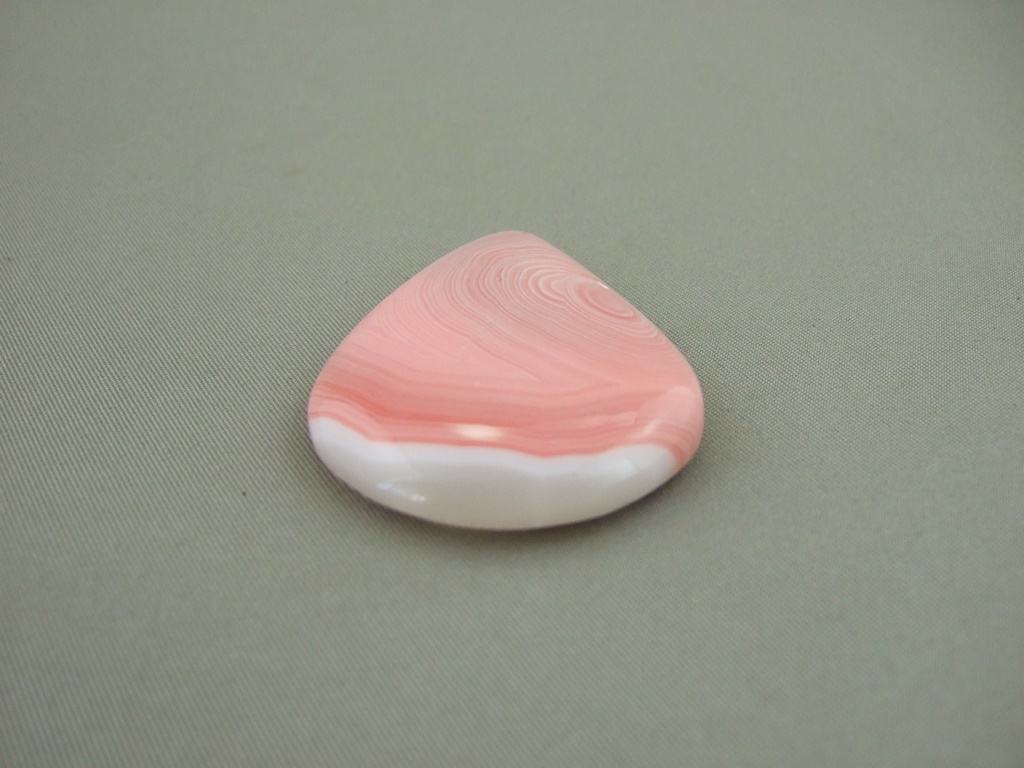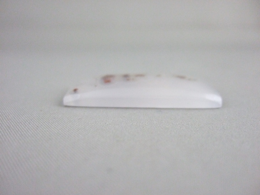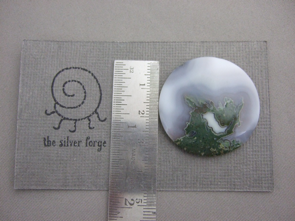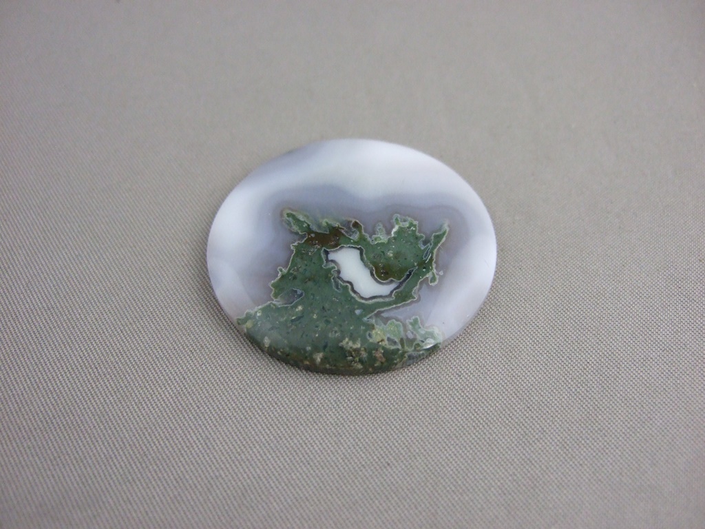 Moss agate is not banded, and therefore not strictly an Agate in scientific terms; but is included in the agate family. Agate is a variety of chalcedony, a mineral of the quartz family. It is clear to milky white, and is dendritic, meaning it has tree or fern-like inclusions (from the Greek dendron, meaning tree). The inclusions in this piece are probably iron.