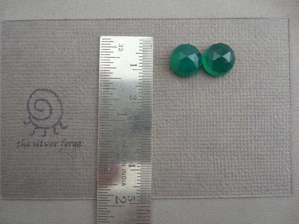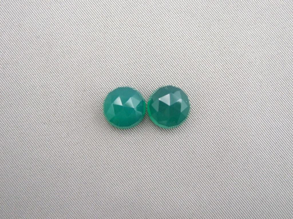 The green onyx rose cut gemstone cabochons shown here are 10mm in diameter, and are available to be handcrafted into custom pieces for you.